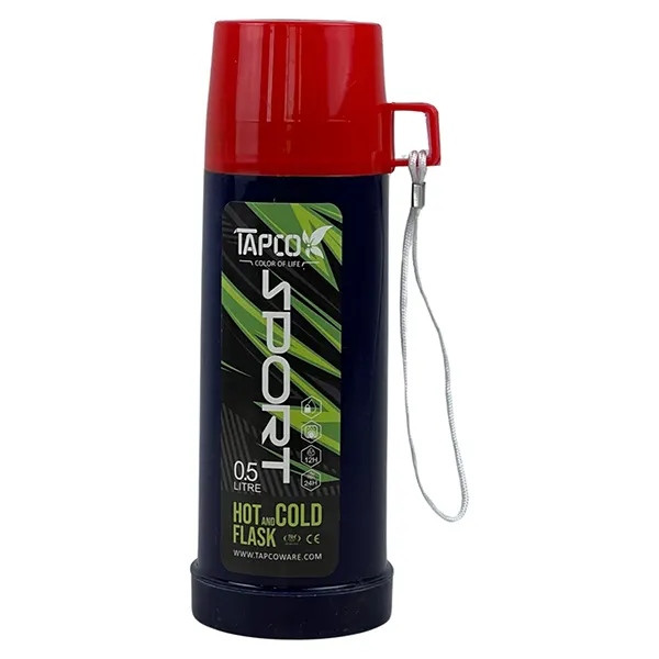 فلاسک نیم لیتری برند تاپکو در چهار رنگ قرمز-مشکی، زرد-مشکی، آبی و صورتی یک فلاسک مناسب برای مصرف روزانه است.