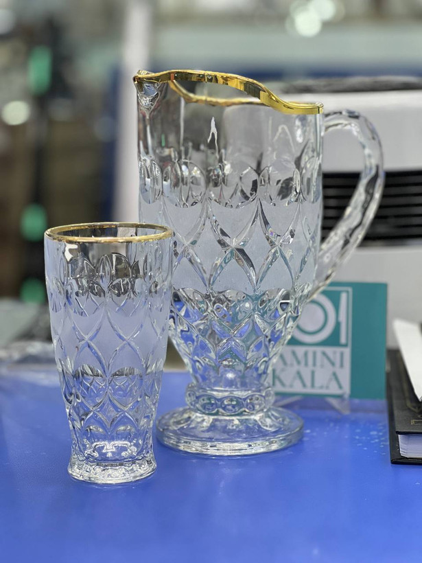 این سرویس شامل یک عدد پارچ و شش لیوان با لبهی طلایی است.