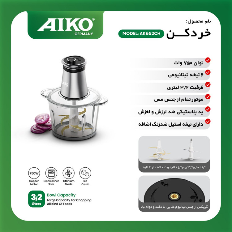 خردکن AK-652 آیکو، انتخابی ایدهآل برای کسانی است که به دنبال یک دستگاه قدرتمند و با کیفیت برای تسهیل در آمادهسازی غذا هستند. با این خردکن، میتوانید به راحتی انواع سبزیجات، میوهها و دیگر مواد غذایی را آماده کنید و از آشپزی لذت ببرید.