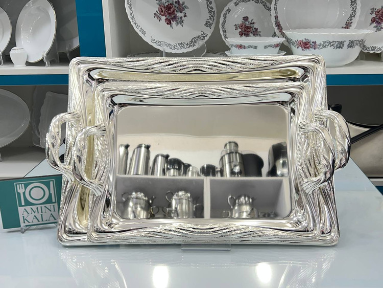 • طراحی: سینیها با طرح آینهای و نقرهای رنگ، جلوهای شیک و لوکس به میز پذیرایی شما میبخشند.